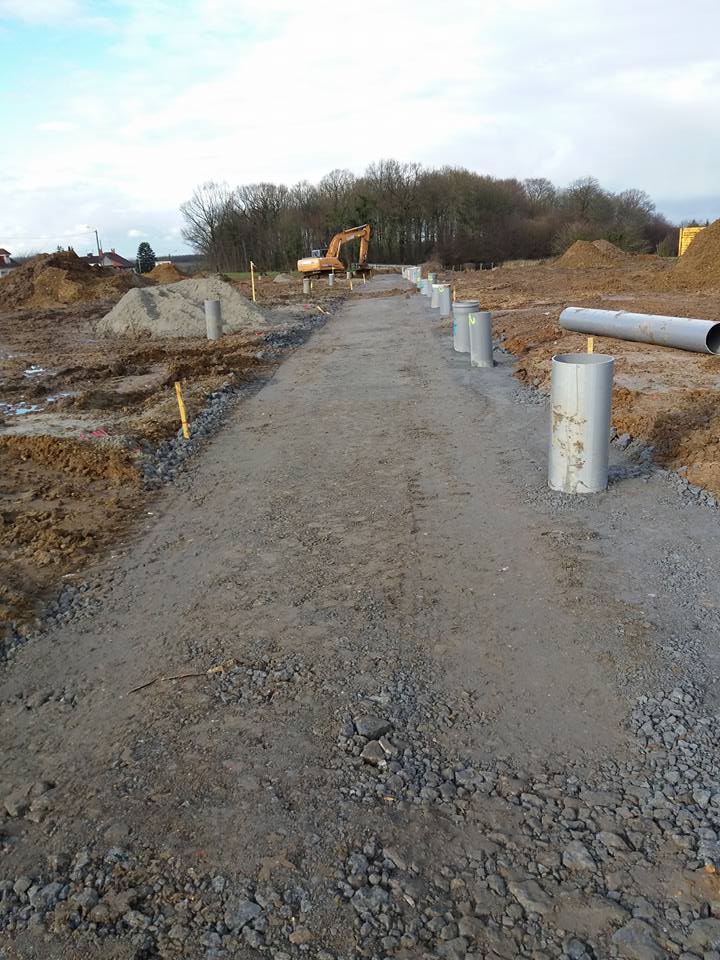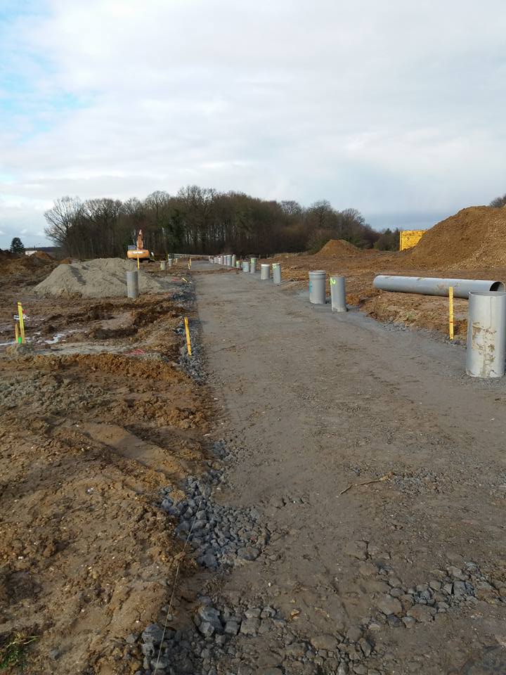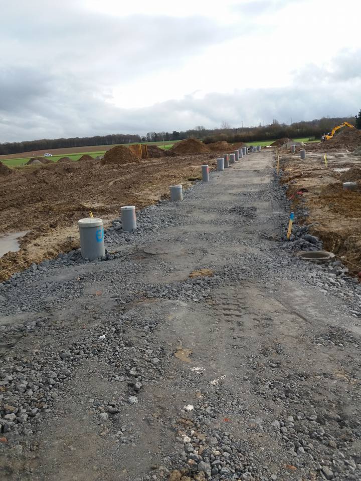 assainissement eaux usées et voirie primaire réalisée, ouvrages de tamponnement des eaux pluviales de la chaussée en cours.